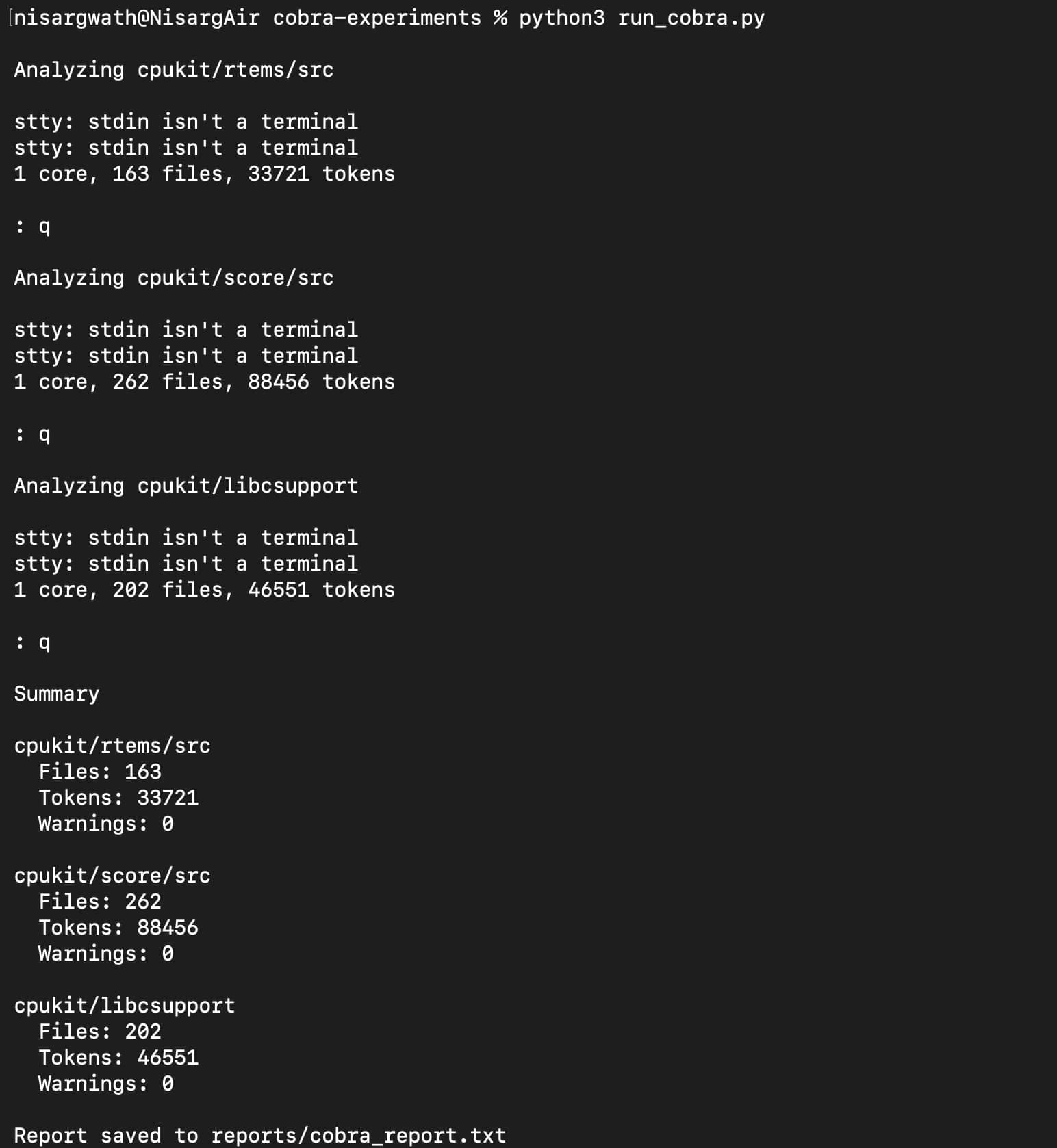 I ran Cobra across the cpukit modules (score, rtems, and libcsupport). These processed several hundred files but produced no warnings. Earlier runs showed some warnings in BSP headers, so I’m planning to compare cpukit and BSP directories to see where most static analysis noise originates.