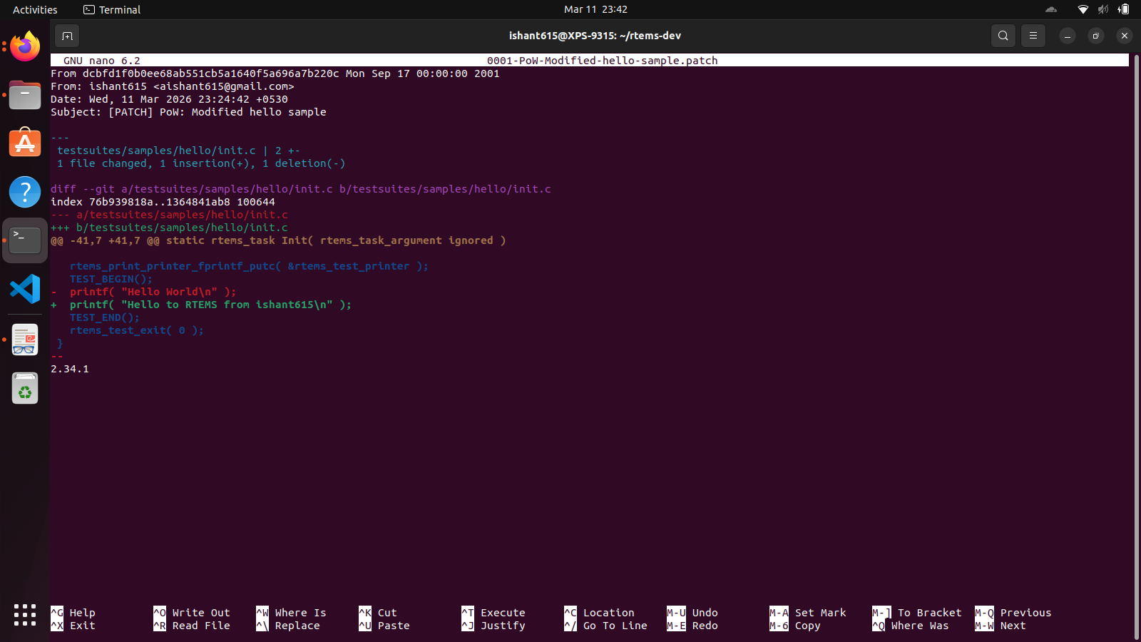 Hello everyone, Ishant this side, a student of electronics engineering. I am eager to contribute to RTEMS through GSoC using my relevant skill set and experience in RTOS and embedded systems. I have attached here, the output of the modified hello task and the patch file screenshot along with it. I am interested in the RISC-V libbsd support project and have some experience with RISC-V systems and I hope to utilize that for this project.