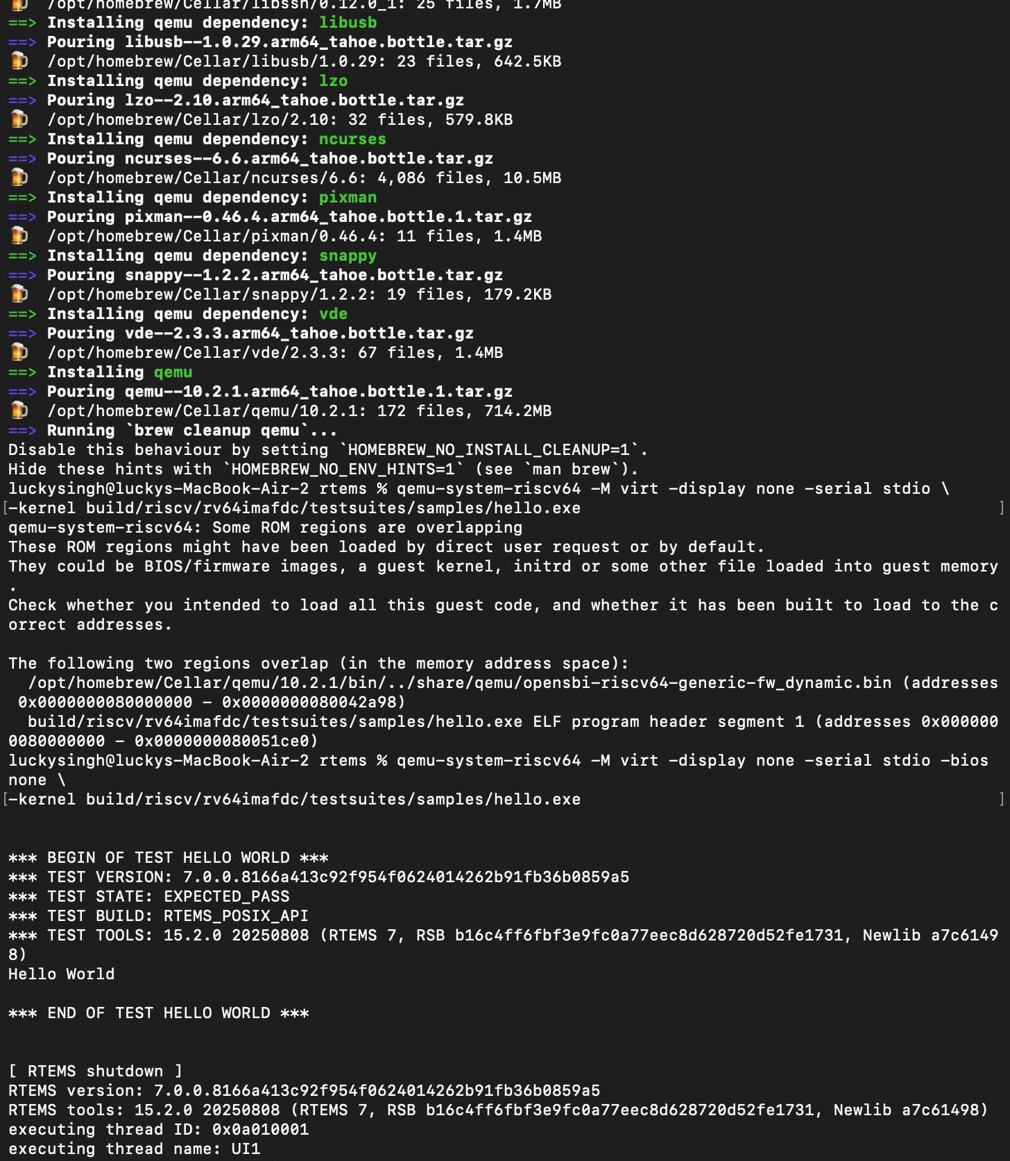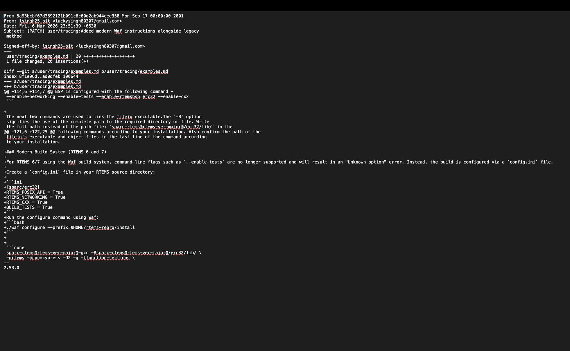 I have successfully set up the RTEMS 7 kernel environment on my macOS . During this process, I noticed that the user/tracing/examples.md documentation still references legacy Autotools configuration flags ( --enable-tests), which lead to “Unknown option” errors in newer versions.