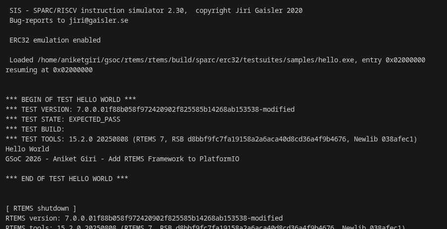 + printf( "GSoC 2026 - Aniket Giri - Add RTEMS Framework to PlatformIO\n" );