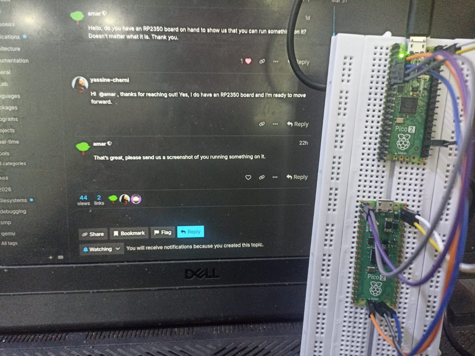 I’ve attached a screenshot of the terminal output and a photo of my physical setup.