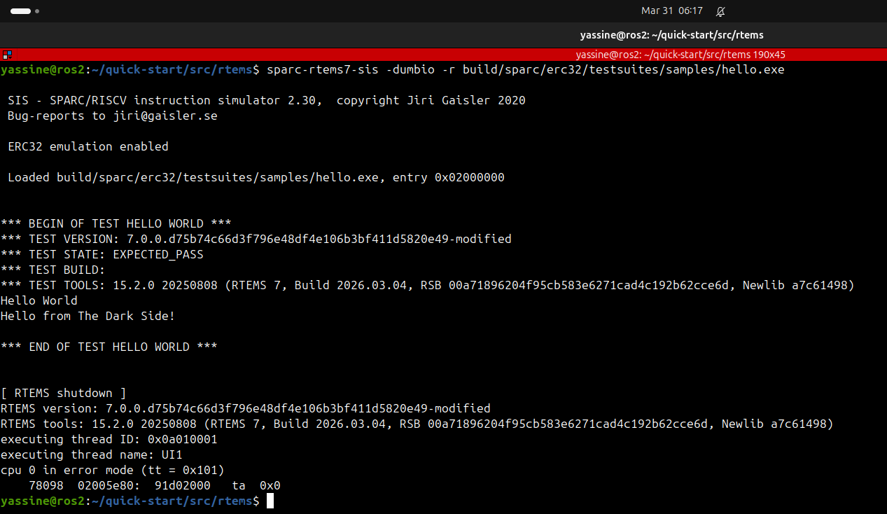 I noticed issue #5536 still has no proposal, so here I am. I have completed the Getting Started guide built the erc32 BSP, modified the Hello World sample and ran it in the simulator. Screenshot and patch attached.