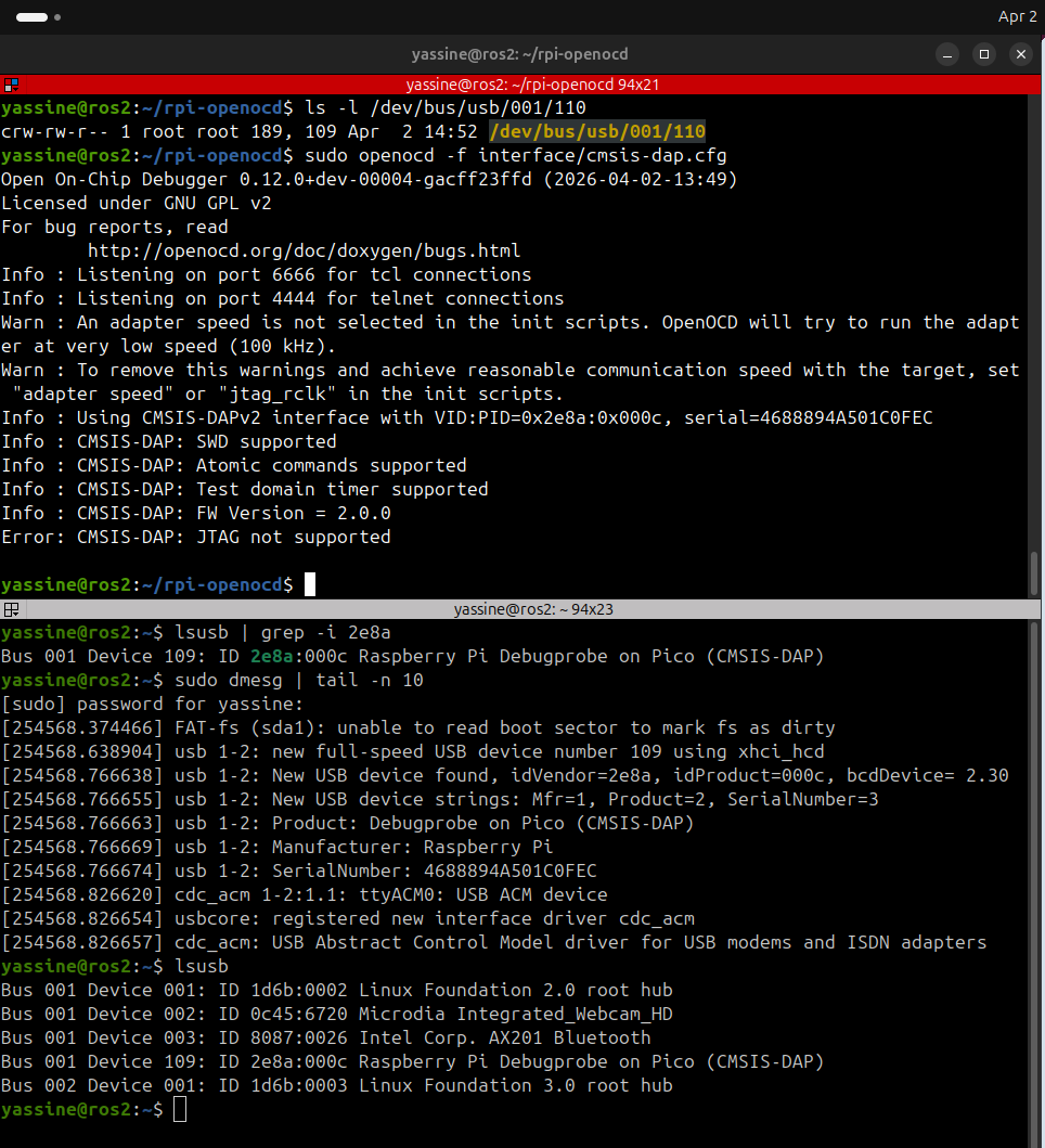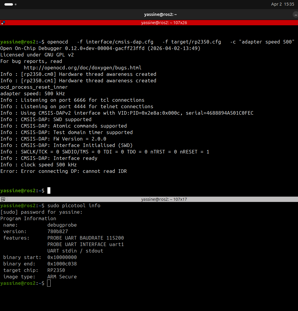 My approach uses two RP2350 boards ( RPI Pico 2 ): one configured as a Debugprobe (CMSIS-DAP) and the other as the target device. The Debugprobe is detected over USB, and I can communicate with the target using picotool and OpenOCD.
