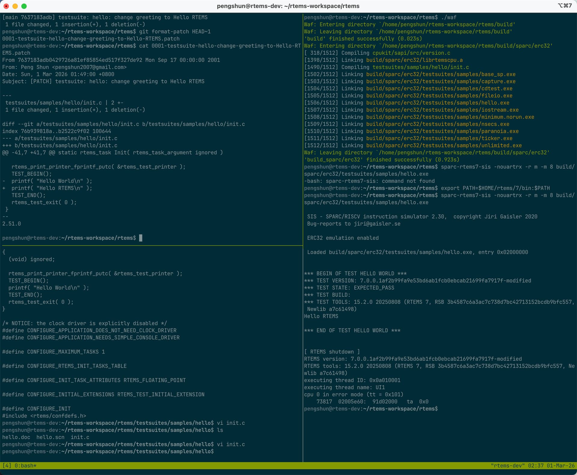 My name is Peng Shun, a freshman in communication engineering. I’ve just setup the environment and changed the greeting to “Hello RTEMS”. The test passed.