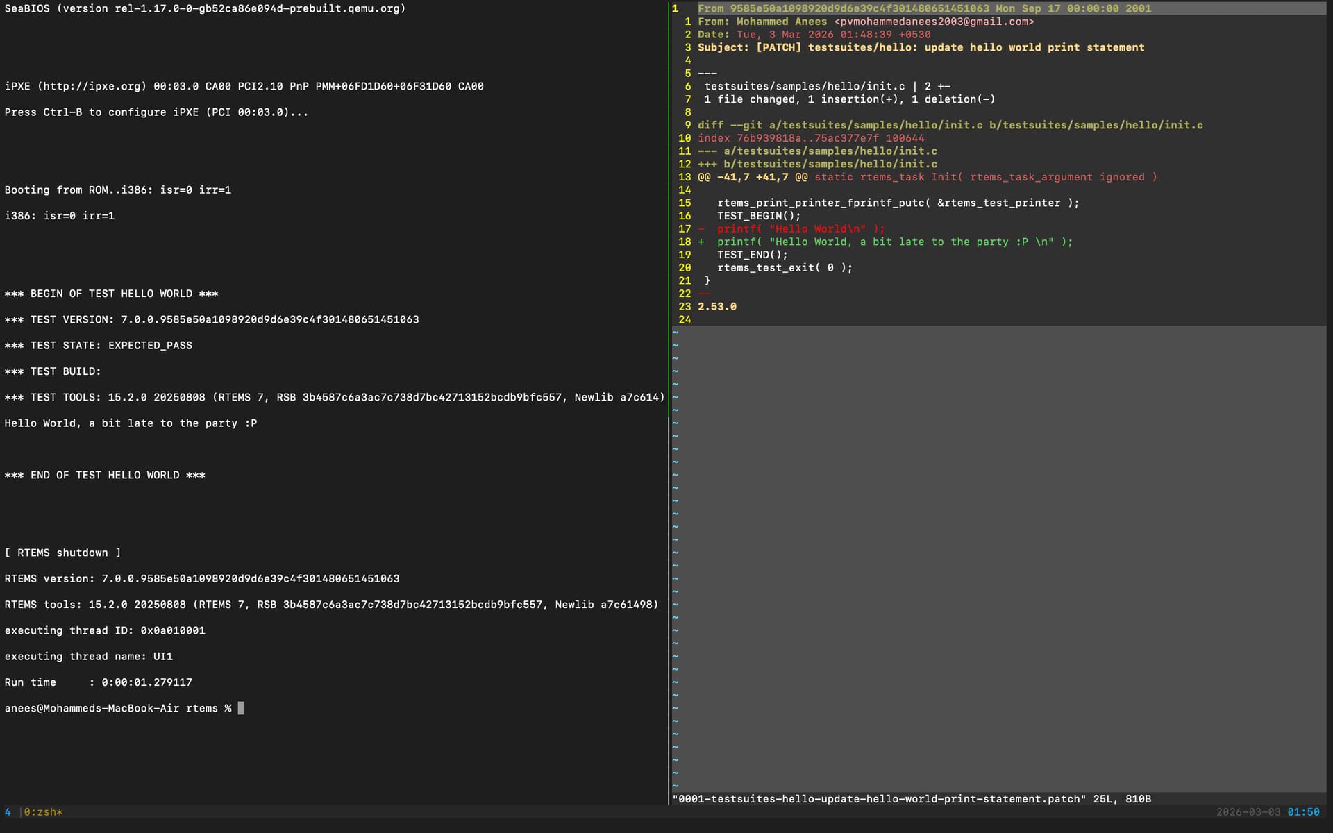 hey everyone, this is Mohammed Anees, I have completed the preliminary task with respect to GSoC and have built RTEMS for the i386/pc386 BSP