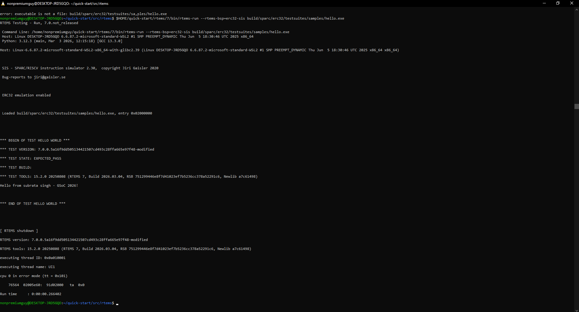 Hello everyone, I am Subrata Singh and I am focusing on systems and embedded C/C++ development for GSOC 2026. I have completed the “Getting Started Guide”, built the RTEMS 7 development head locally via WSL2 (windows 10) and ran the SPARC ‘hello’ and also the ‘ticker’ test.