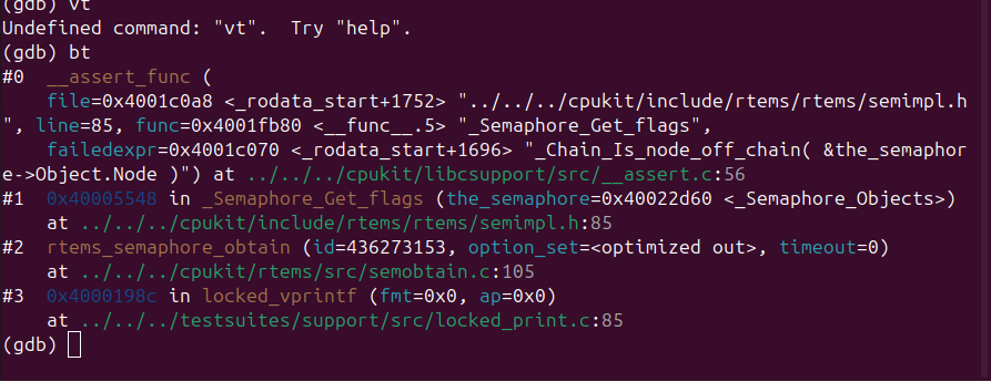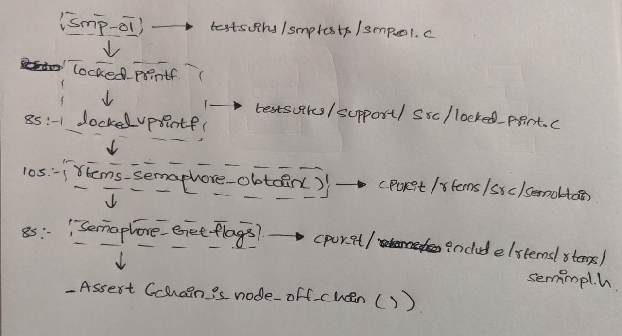 So it wanted a free semaphore , and it called Semaphore_Get_flags which checks if the chain is free by _Chain_is_node_off_chain(), But semaphores store their flags in prev pointer, Since the _Chain_is_node_off_chain() got stricter in debug mode i.e asserts if prev!=null it was throwing error.
