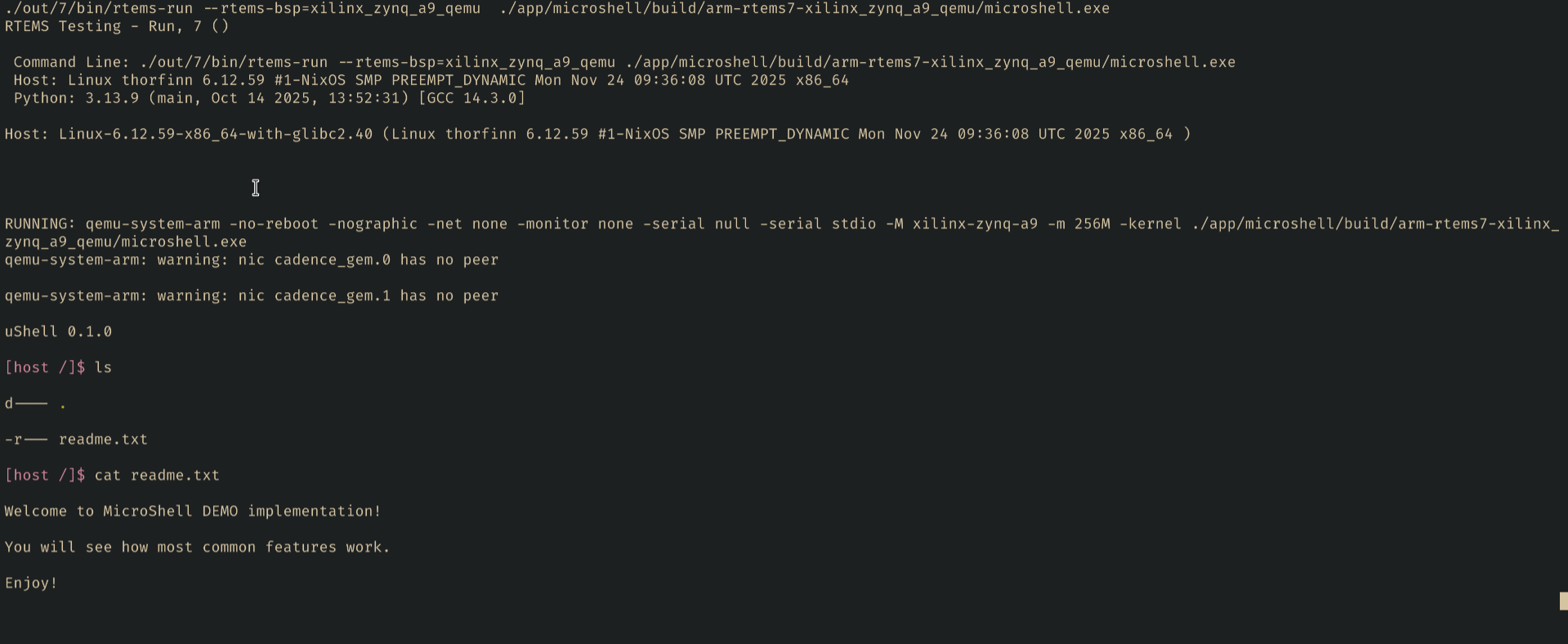 I was able to get microshell’s demo_linux example running for arm/xilinx_zynq_a9_qemu. Created an “external” task which sets up the terminal and then runs the non blocking service in a loop. I was wondering if there’s any documentation which outlines how libraries’ apis are laid out? an overview of some sort. Also I am assuming that the apis microshell would provide under rtems should be very similar to the default shell.