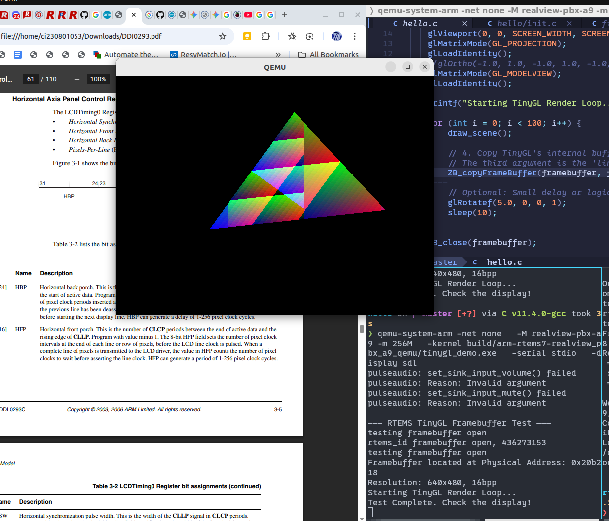 - Changes to TinyGL: There were no major functional changes to the TinyGL core source. The primary work involved modifying the build system to exclude the GLX and X11-dependent files, focusing instead on the core rasterizer and RTEMS-compatible output.